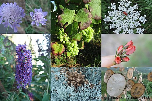 公婆家樓下附近散步道的小花,種類很多,大多是野生的(當然那葡萄是別人種的),右邊中間的那像玫瑰的花我也是第一次看到,很小,大約0.3~0.4cm,長的很像玫瑰,而右下方的那叫不出名字的植物也很怪,原是有籽有薄膜的,剝掉上下外層後就會有一層很透明的薄膜,可美~~