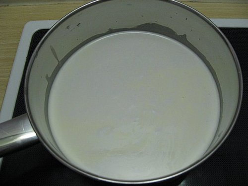 1.將鮮奶油.椰奶.牛奶175ml.洋菜粉.砂糖拌勻後,煮熱.