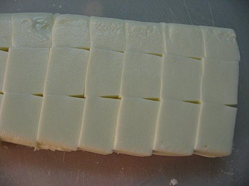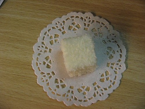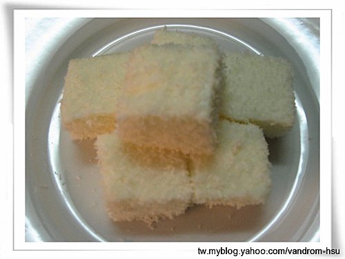 7.冰硬後將雪花糕倒出容器,切成四方大小,沾上椰絲就OK了.