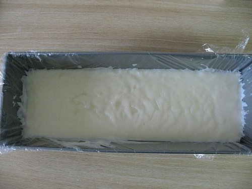 倒入容器中,左右搖勻(或以刮刀刮平)..舖上一層保鮮模,以利脫模